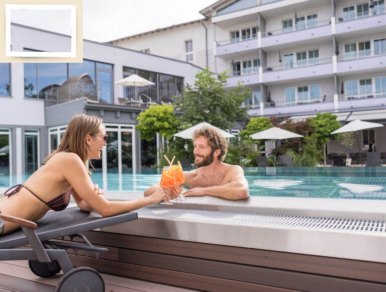 Unser Thermalwasser-Innenpool hat eine Temperatur von wohligen 34°C und unser Thermalwasser-Aussenpool von wohligen 36°C, der Sportpool 29° C, unser Skypool 33° C