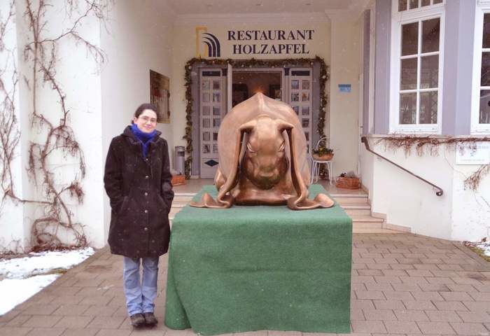 Ab heute wird unser Restauranteingang von einem 5 Zentner schweren Hasen, der über die bevorstehenden Osterfeiertage unsere Gäste begrüßt, geschmückt. Vielen Dank an Künstlerin Susanne Beurer (l.) für die Leihgabe.